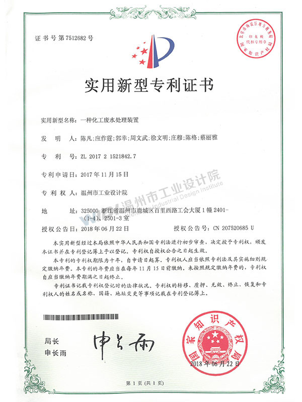 一種化工廢水處理裝置證書