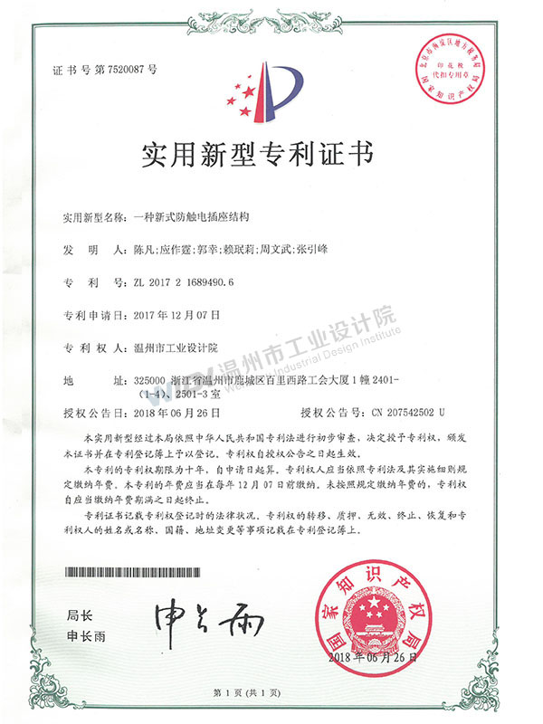 一種新式防觸電插座結(jié)構(gòu)證書